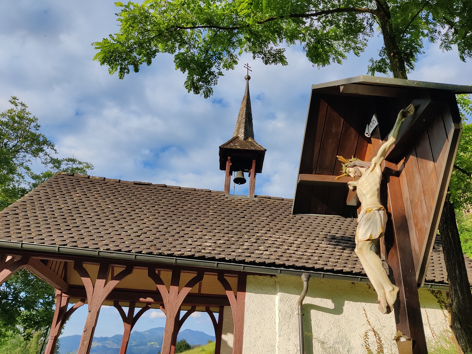 Wer in unserer Zeit den Weg von der Schießstätte zur Kapelle wandert, der kommt an einem kleinen, aber gemauerten Bildstock mit geschindeltem Dach vorbei, in dem eine Statue der Mutter Gottes zum Gebet einlädt. Vielleicht erinnert dieser Bildstock an den alten, seit vielen Jahrzehnten nicht mehr bestehenden Kreuzweg, zu dem ebenso das seitwärts der Kapelle befindliche Feldkreuz mit neuerem Kruzifixus gehört haben könnte.
