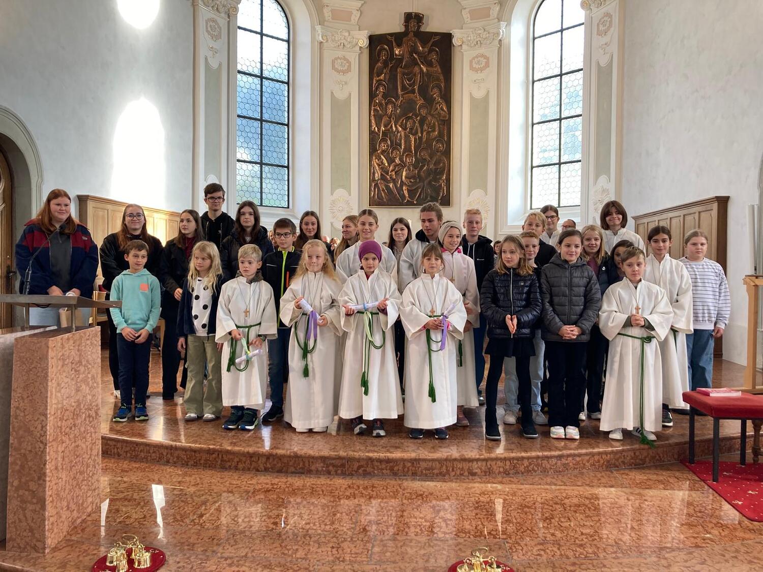 Am Weltmissionssonntag durften wir 6 neue Ministranten und Ministrantinnen in die Gemeinschaft der Ministranten aufnehmen. Pfarrer Romeo freute sich sehr, dass so viele von den aktiven Ministranten in die Kirche gekommen sind und dieses Fest mitfeierten. Die Gemeinschaft unserer Minis war spürbar.